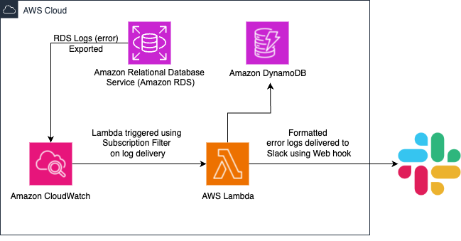To process, we implement a Lambda function that automatically triggers when errors are detected. The Lambda function is configured with necessary permissions and dependencies to decode the log data and format it into readable messages. These messages are first saved in a Amazon DynamoDB table and then delivered to a designated Slack channel through a secure webhook integration, enabling immediate notification to database administrators and support teams.