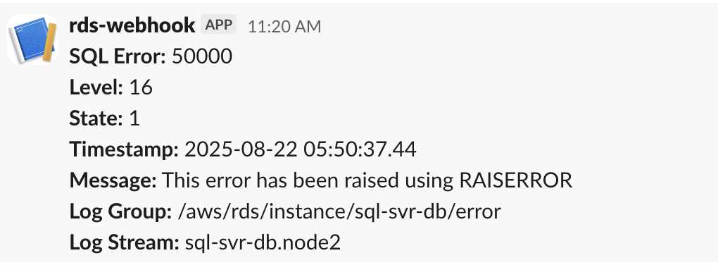 With this final step, you have completed the implementation of your automated Amazon RDS for SQL Server monitoring solution. The system is now ready to capture SQL Server errors and send notifications to your Slack channel. The Lambda function will use the webhook URL to securely communicate with Slack, making sure your team receives immediate notifications when database errors occur. These notifications include essential information such as the error message, timestamp, and contextual details, enabling your team to quickly assess and respond to potential issues. The system operates continuously in the background, requiring no manual intervention for monitoring database logs.