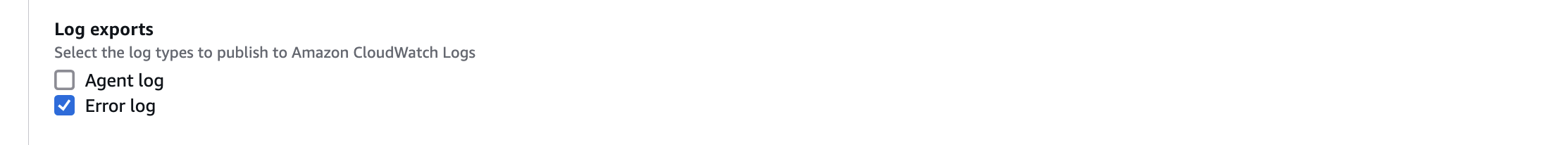 - In the Log exports section, choose the logs that you want to start publishing to CloudWatch. For this post, we select Error log and click Continue.