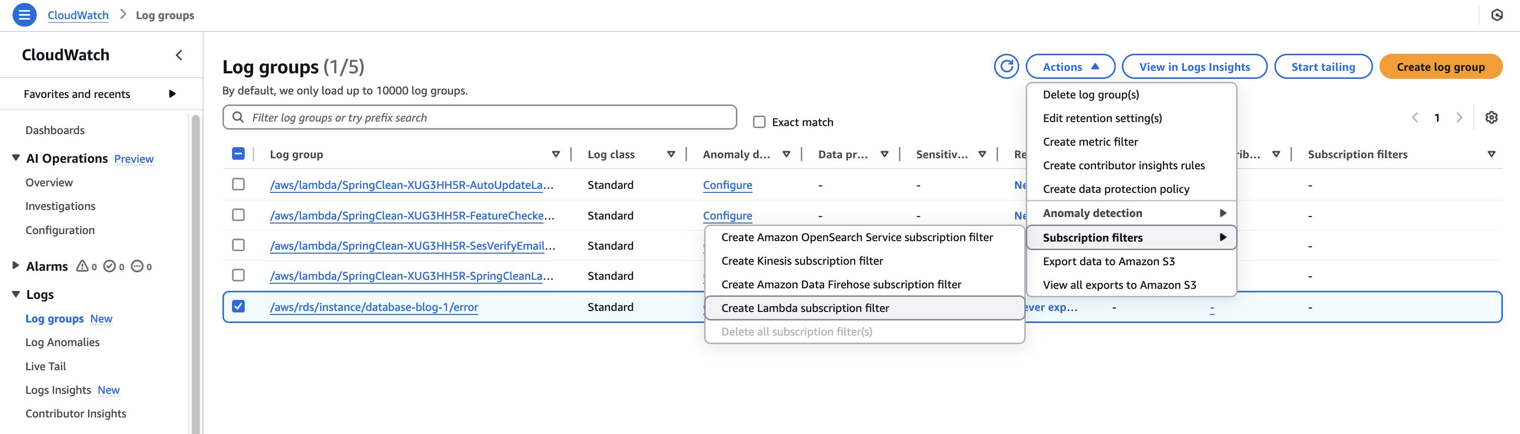 - On the Actions menu, choose Subscription filters and select Create Lambda subscription filter.