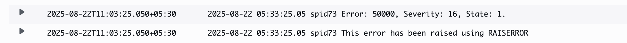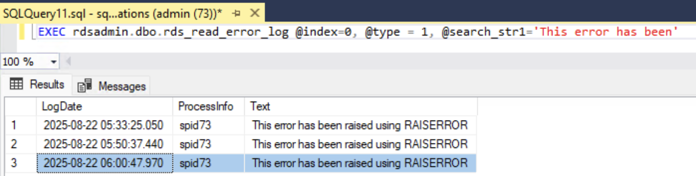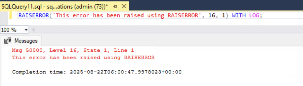 , as shown in the following screenshot. - Create an error message using the RAISERROR WITH LOG option for demonstration purposes: