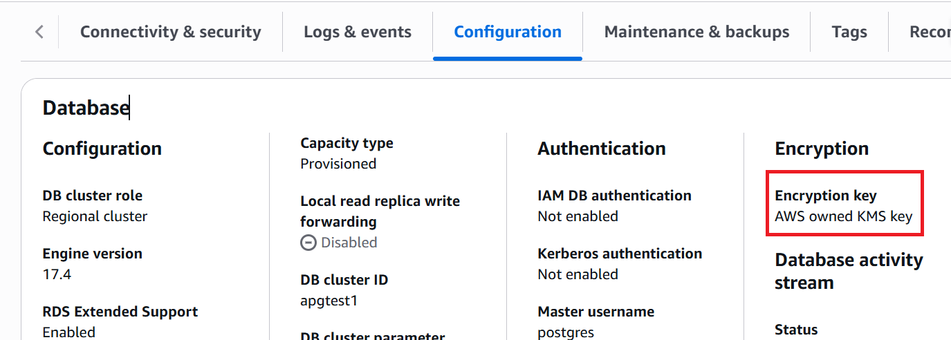 When a new cluster is created with AWS owned keys, the StorageEncrypted field will show false, while the StorageEncryptionType field will show sse-rds. This indicates that while you didn’t choose to encrypt the database, the data is still encrypted at rest using AWS owned keys.