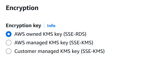 - AWS owned key (SSE-RDS) – A fully AWS-controlled encryption key that you cannot view or manage, used automatically by Aurora for default encryption.