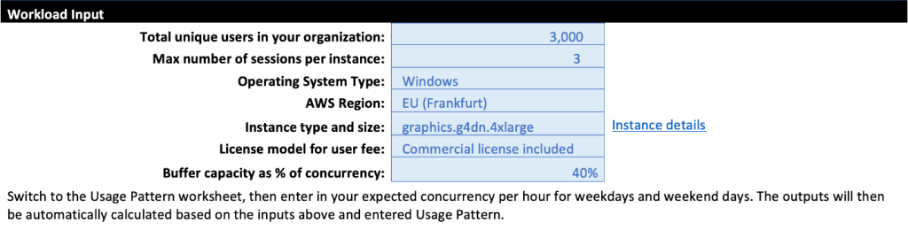 Now suppose you are an industrial engineering company that wants to stream GPU-intensive applications like SOLIDWORKS or Siemens NX to your design engineers who are located in France, Germany, and Italy. Currently you are deploying engineering workstations, but your engineers want portability in how and where they work by using ultrabooks. You want to estimate the cost of using WorkSpaces applications GPU-backed instances to augment providing your design engineers with ultrabooks. Your product lifecycle management and product data management infrastructure are in the Frankfurt (eu-central-1) AWS Region, and you have 3,000 design engineers who will stream sporadically throughout the day. You are going to use the stream.graphics.g4dn.2xlarge for your design engineers to ensure they have sufficient CPU, memory, and GPU for them. You don’t have existing RDS CALs to port, so you will be buying them from AWS. You’re not too sure on your usage pattern, and so you want to maintain extra buffer capacity of 40% during the onboarding phase, then adjust after usage is identified. On weekends, you don’t expect any usage, but want to maintain some capacity for the design engineers who may need it. On the Price Estimator worksheet, you would enter: