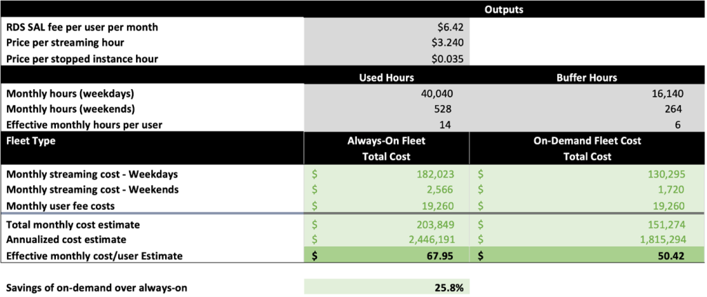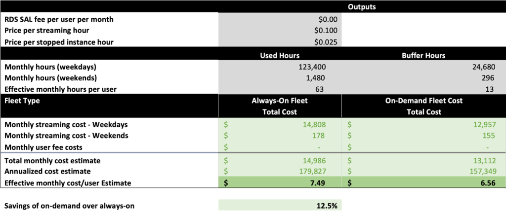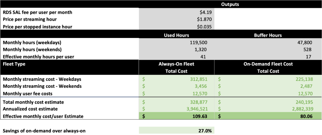 Based on this usage pattern and the environment details, the WorkSpaces applications Pricing Tool estimates that the effective monthly cost per user per month would be $109.63 for an Always-On fleet, or $80.06 for an On-Demand fleet. In this scenario, you can save 27.0% with your users waiting up to 90 seconds for their application to launch with an On-Demand fleet. You can find this at the bottom of the Price Estimator worksheet: