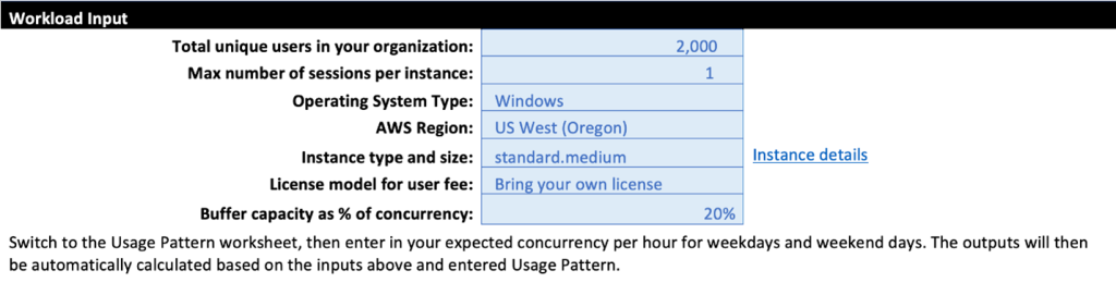 Suppose you are an enterprise that uses an application streaming technology to stream the SAP GUI to your users, or you’re a financial ISV that wants to stream your accounting software to your customers as a service and need to estimate the price of using WorkSpaces applications. Your infrastructure is built in the Oregon (us-west-2) AWS Region, and you have 2,000 total users that will stream during the month. The application runs perfectly using the stream.standard.medium instance type and size. Your usage is fairly predictable during the weekday, so you maintain a 20% buffer, with sporadic usage over the weekend. Your enterprise has Microsoft License Mobility, enabling you to port your RDS CALs to AWS for use with WorkSpaces applications. For users covered by your RDS CALs, you won’t incur monthly user fees. Your inputs on the Price Estimator worksheet will look like this:
