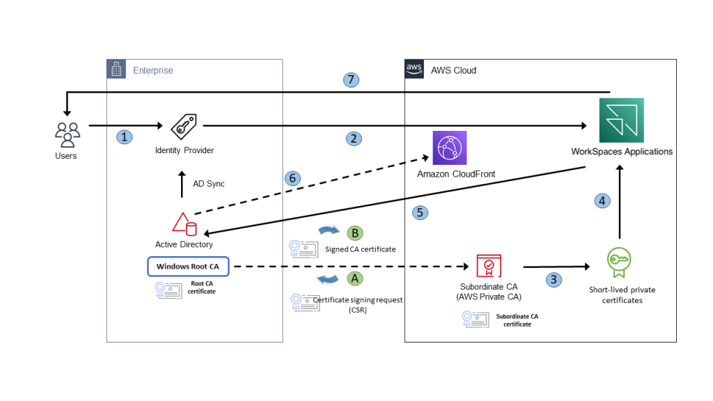 - WorkSpaces Applications seamlessly authenticates you to Active Directory using the short-lived certificate issued from the subordinate CA hosted in AWS Private CA.