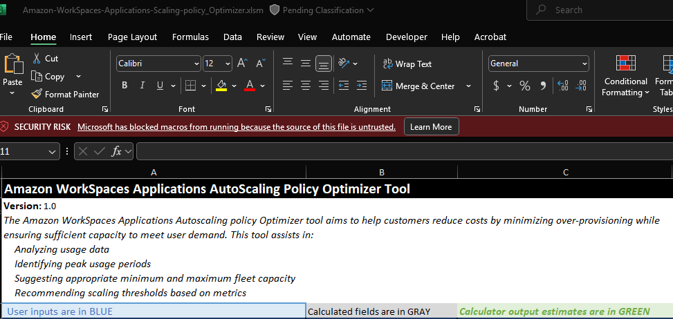 ALT: Screenshot of a macro-enabled Excel spreadsheet (.xlsm file) for the Amazon WorkSpaces Applications AutoScaling Policy Optimizer Tool. A red security risk banner stating “Microsoft has blocked macros from running because the source of this file is untrusted” with a “Learn More” link