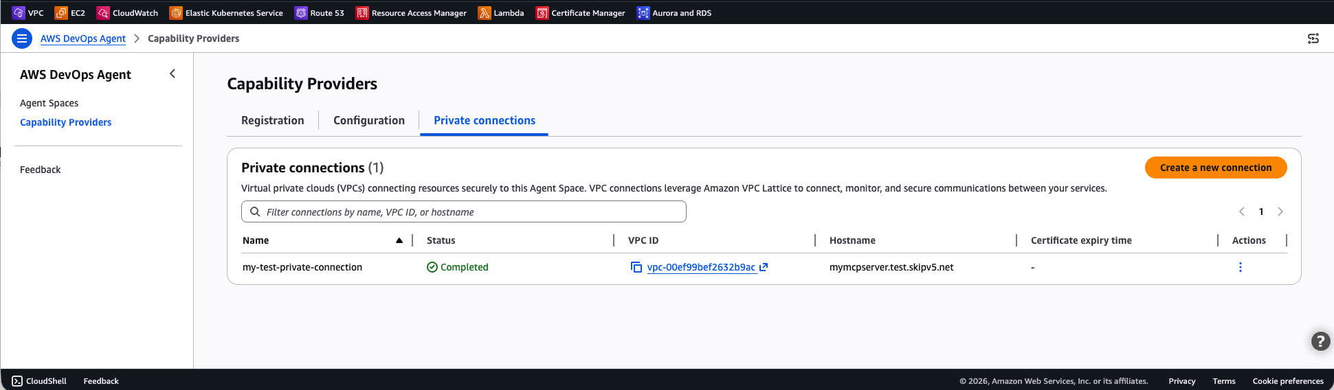 After the private connection reaches the Completed state, verify that AWS DevOps Agent can reach your target service: