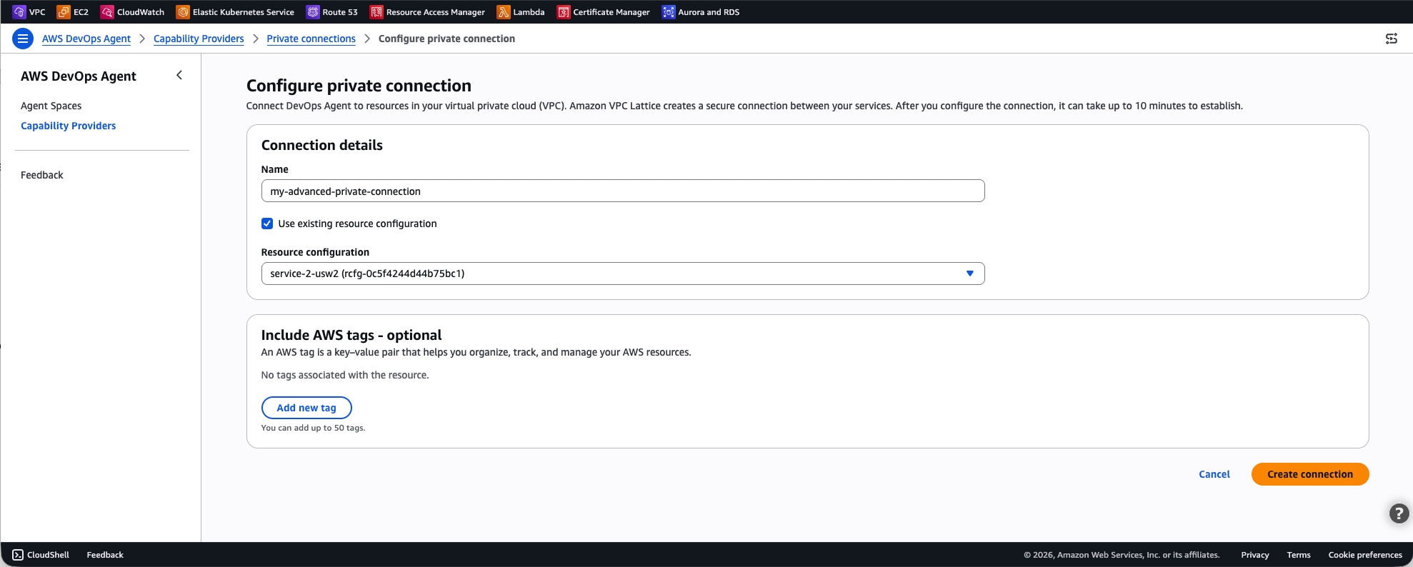 If your organization already uses Amazon VPC Lattice and manages your own resource configurations, you can create a private connection in self-managed mode. Instead of having AWS DevOps Agent create a resource gateway for you, you provide the Amazon Resource Name (ARN) of an existing resource configuration that points to your target service.
