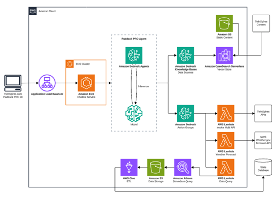 The agent can query Amazon Bedrock Knowledge Bases for Retrieval-Augmented Generation (RAG), pulling in structured and unstructured data from documents stored in Amazon S3 as well as content hosted on the TwinSpires website and other integrated proprietary data sets.