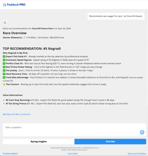 Within seconds, Paddock PRO receives player prompts, enriches them with real-time and historical data, and delivers a generated response powered by a state-of-the-art LLM. Whether a player is asking about specific information or needs assistance with crafting a competitive wager, Paddock PRO places the depth of TwinSpires’ industry knowledge directly into the player’s hands.