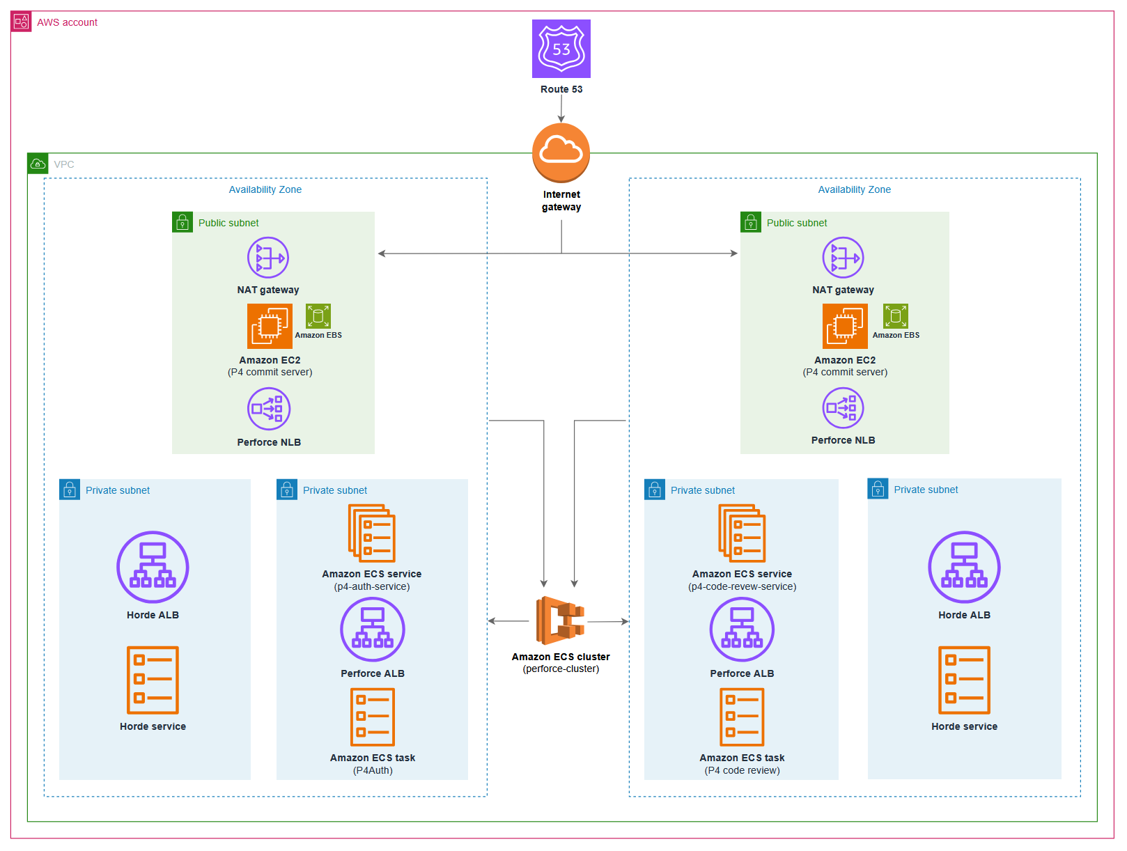 The following expanded architecture diagram shows both Perforce and Horde running on Amazon ECS with supporting AWS services.