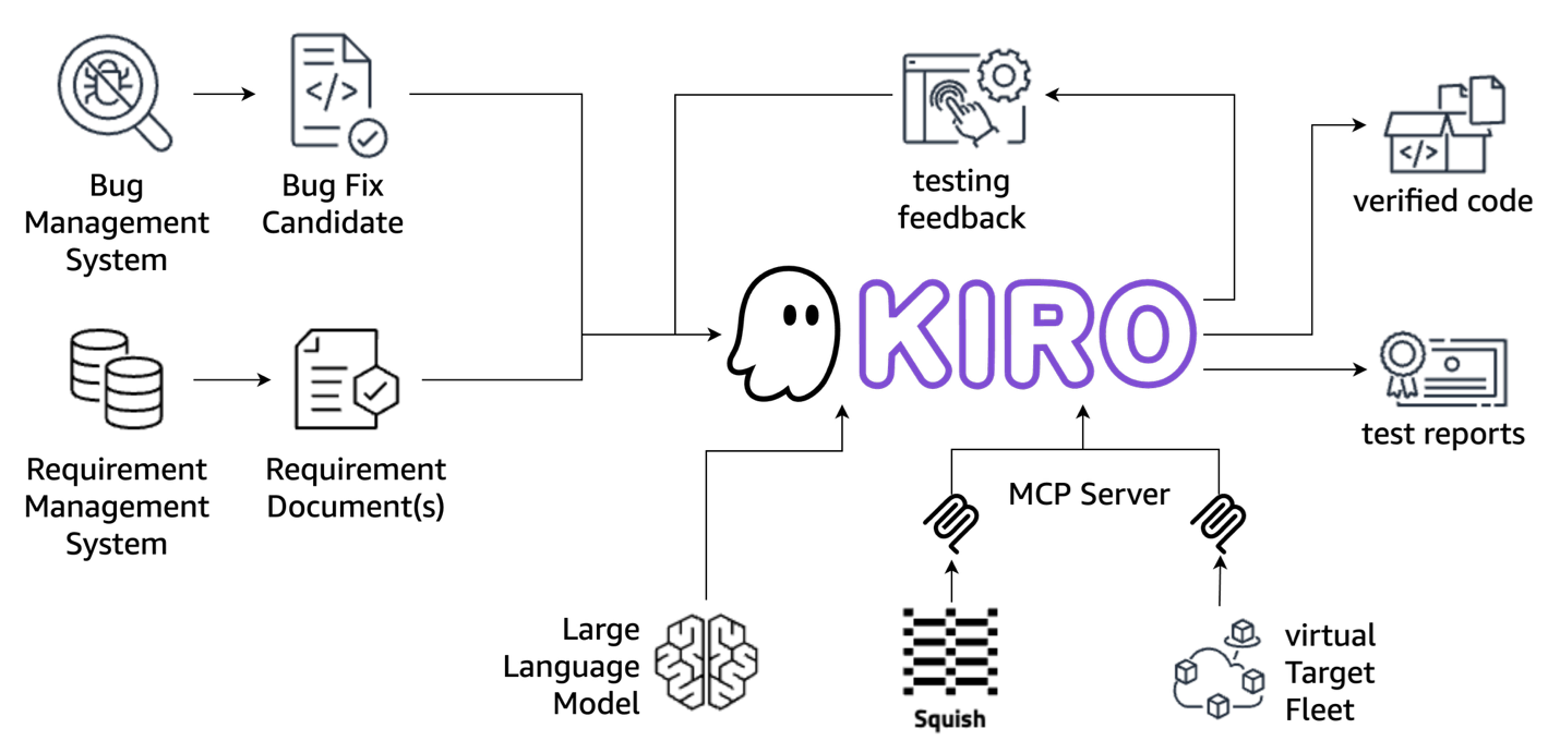 Figure 1- High-level workflow illustrates an automotive UI development automation. Bug Management System and Requirement Management System feed inputs into Kiro, which uses Large Language Models to generate test scripts from natural language specifications. Kiro sends test scripts to Squish via MCP Server for execution on a Virtual Target Fleet running on AWS. Test results and verification reports flow back through MCP Server to Kiro, creating a continuous feedback loop. The system produces verified code and test reports while integrating with CI/CD pipelines for shift-left testing. Through Amazon WorkSpaces, globally distributed teams can securely access Kiro and Squish. They work with vEDTs running on AWS in a workflow centered on synchronized natural language specifications as a single source of truth. vEDTs run the same software stack as physical devices, enabling parallel workflows that catch integration issues early. BMW demonstrated this approach by scaling their virtual testing infrastructure, to reduce cost, accelerate time-to-market and improve our customer’s experience.