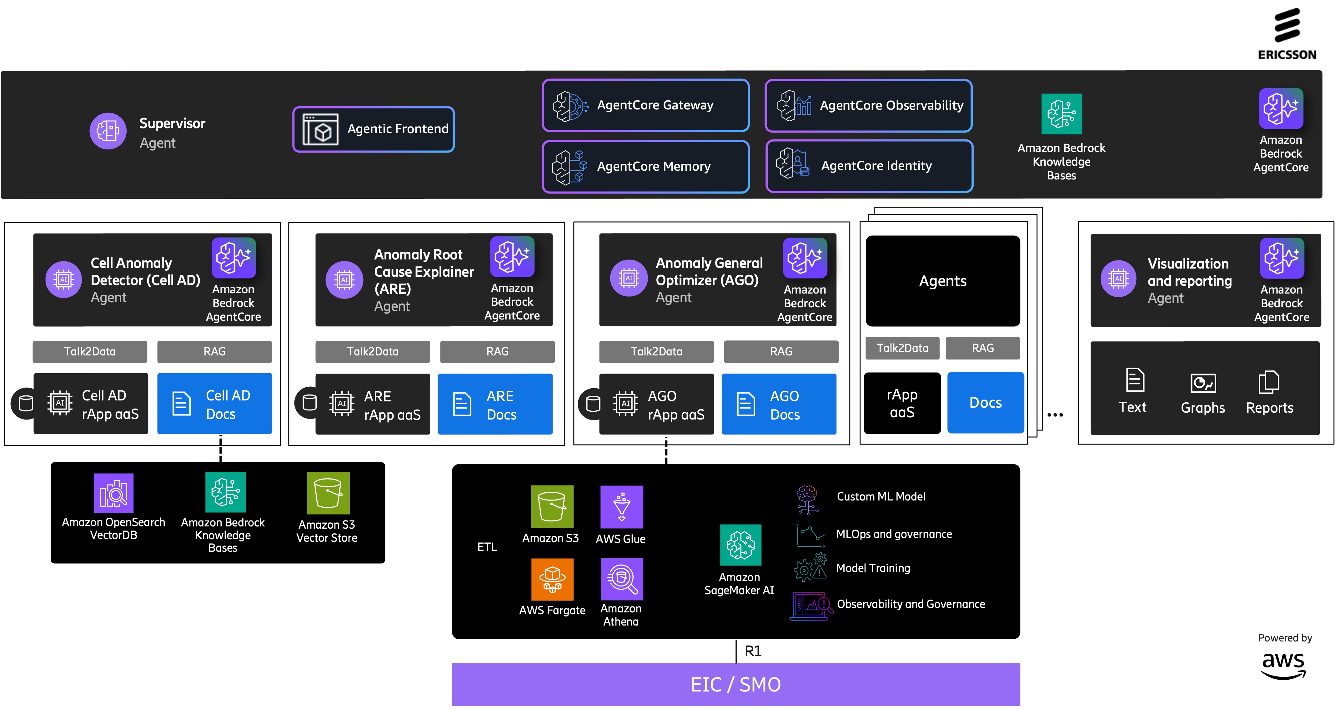 rApp aaS leverages a comprehensive suite of AWS services to deliver scalable, secure, and cost-effective network optimization. At its core, the platform utilizes serverless compute services including Amazon ECS on AWS Fargate for containerized workload orchestration, AWS Glue for data integration and ETL processing, Amazon Athena for interactive analytics on network telemetry data, and AWS Lambda for event-driven automation. The ML lifecycle is supported end-to-end through Amazon SageMaker AI, enabling model training, deployment, and inference at scale to power the AI-driven network optimization capabilities. The agentic AI layer, which enables natural language interactions and intent-based workflows relies on Amazon Bedrock’s agent capabilities, allowing specialized AI agents to coordinate for autonomous network operations. The solution is architected as a multi-tenant SaaS platform, delivering robust tenant isolation and streamlined operations that enable Ericsson to efficiently serve multiple CSPs while maintaining security, compliance, and operational excellence at scale.