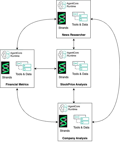 Financial research faces several challenges: integrating diverse data sources is complex, processing multiple data types requires specialized tools, and maintaining consistent analysis quality becomes difficult in fast-changing markets. The financial research and analysis system powered by Amazon Bedrock AgentCore addresses these obstacles through a collaborative multi-agent system using a swarm pattern that transforms financial research from a manual, time-intensive process into an automated intelligence platform. By deploying specialized Amazon Bedrock AgentCore agents for stock price analysis, financial metrics calculation, company profiling, and news sentiment analysis, all coordinated through shared memory and Amazon Nova Pro, this multi-agent solution generates comprehensive equity research reports in minutes rather than hours.