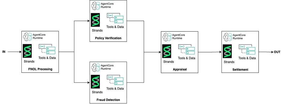 Autonomous claims adjudication using agent workflows with Strands Agents addresses the complex challenge of automating multi-step insurance claims across the entire process. This starts with first notice of loss (FNOL), which represents the initial claim notification an insurer receives. The FNOL process captures incident details, damage assessments, and policyholder information that triggers the claims investigation process. Following this, damage appraisal, and settlement phases continue and conclude the clam adjudication process. This implementation uses a workflow pattern with sequential processing capabilities. The implementation has three phases: FNOL automation, intelligent appraisal, and autonomous settlement. Each phase uses specialized AI agents for specific tasks.