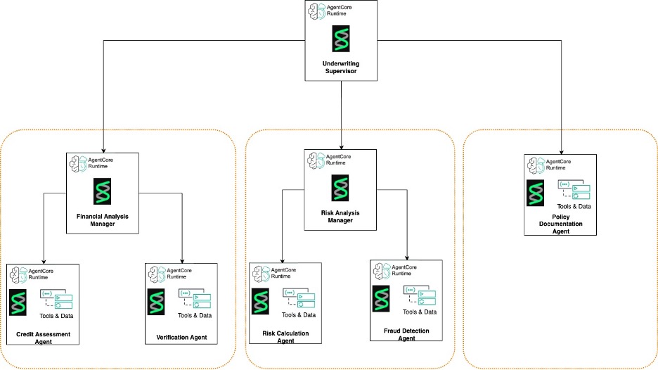 Significant challenges impact traditional loan application processing, challenges including time-intensive manual underwriting, complex documentation handling, and the need to maintain strict compliance standards while managing risk across multiple departments. The intelligent loan application processing system addresses these obstacles by demonstrating the power of graph pattern, which use hierarchical multi-agent architectures in automating complex financial decision-making processes. This Amazon Bedrock AgentCore implementation, using Strands Agents, mirrors real-world financial institution structures with a loan underwriting supervisor orchestrating specialized departments including financial analysis and risk analysis managers, each overseeing domain-specific agents for credit assessment, verification, risk calculation, fraud detection, and policy documentation.