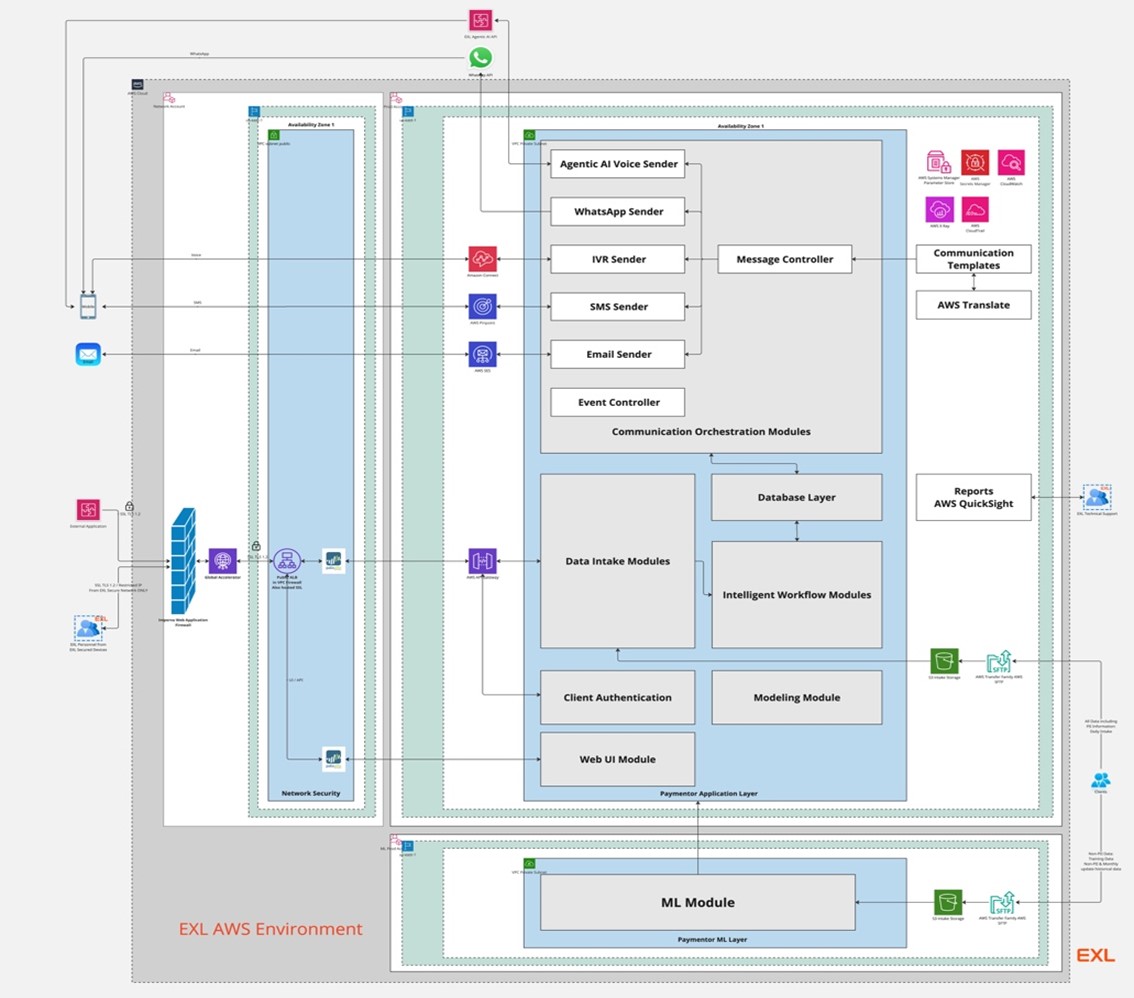 To address these challenges, EXL developed PayMentor – an AI-powered collections platform built on AWS that uses machine learning to personalize customer outreach, optimize channel selection, and automate communication workflows at enterprise scale.