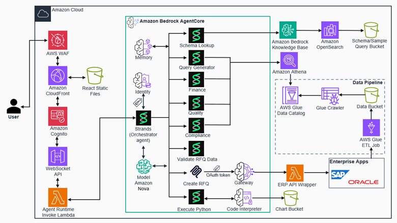This design delivers conversational access to supplier analytics, automated compliance verification, intelligent sourcing recommendations, and direct RFQ creation—combining Strands’ intelligent orchestration with Amazon Bedrock AgentCore managed infrastructure.