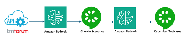 The solution uses Amazon Bedrock with Claude to interpret TM Forum API specifications and automatically generate standardized Gherkin scenario. These scenarios are then converted into Java code stubs, streamlining your test development process.