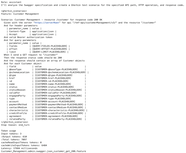 This post has shown you how to generate comprehensive Gherkin scenarios and corresponding Cucumber test code from TM Forum API specifications using Amazon Bedrock and Claude. The solution follows an iterative approach, starting with a base prompt and refining it through multiple iterations based on best practices like providing clear examples, allowing the foundation model to think through problems step-by-step, using XML tags for structured outputs, and setting appropriate parameters.