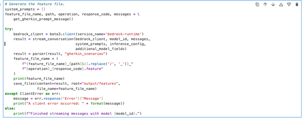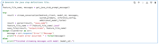 5. Invoke the Amazon Bedrock converse API to generate the Java stub code. The notebook sends your selected Gherkin feature file to Claude through Amazon Bedrock, which processes the content and returns the corresponding Java implementation code.