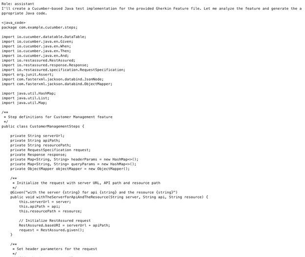 The notebook automatically saves your generated Cucumber test scenarios in a structured output directory. You can examine both your generated Java cucumber test case and the explanations provided by Claude. The organized folder structure makes it easy for you to locate specific test cases and track the generation process for each API endpoint you’ve tested (As shown in figure 13 and 14).