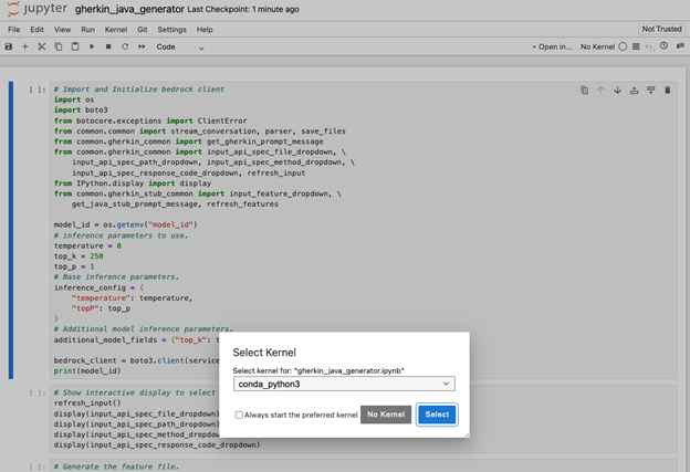 The solution runs in an Amazon SageMaker notebook deployed in your VPC, where you can select specific API paths, methods, and response codes for scenario generation. Amazon Bedrock serves as the secure foundation model platform where your API specifications are processed by Claude’s advanced natural language capabilities to extract test requirements and convert them into structured BDD scenarios. The notebook environment provides you with a familiar development experience while maintaining security through your VPC configuration. (As shown in figure 2)