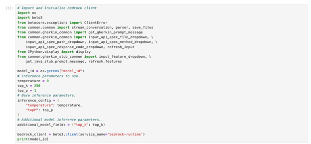 1. Run the first code cell to import and initialize the bedrock runtime and set up model parameters. The Claude model uses three key parameters: temperature (set to 0 for consistent outputs), top_p, and top_k (both using default values) to control text generation.