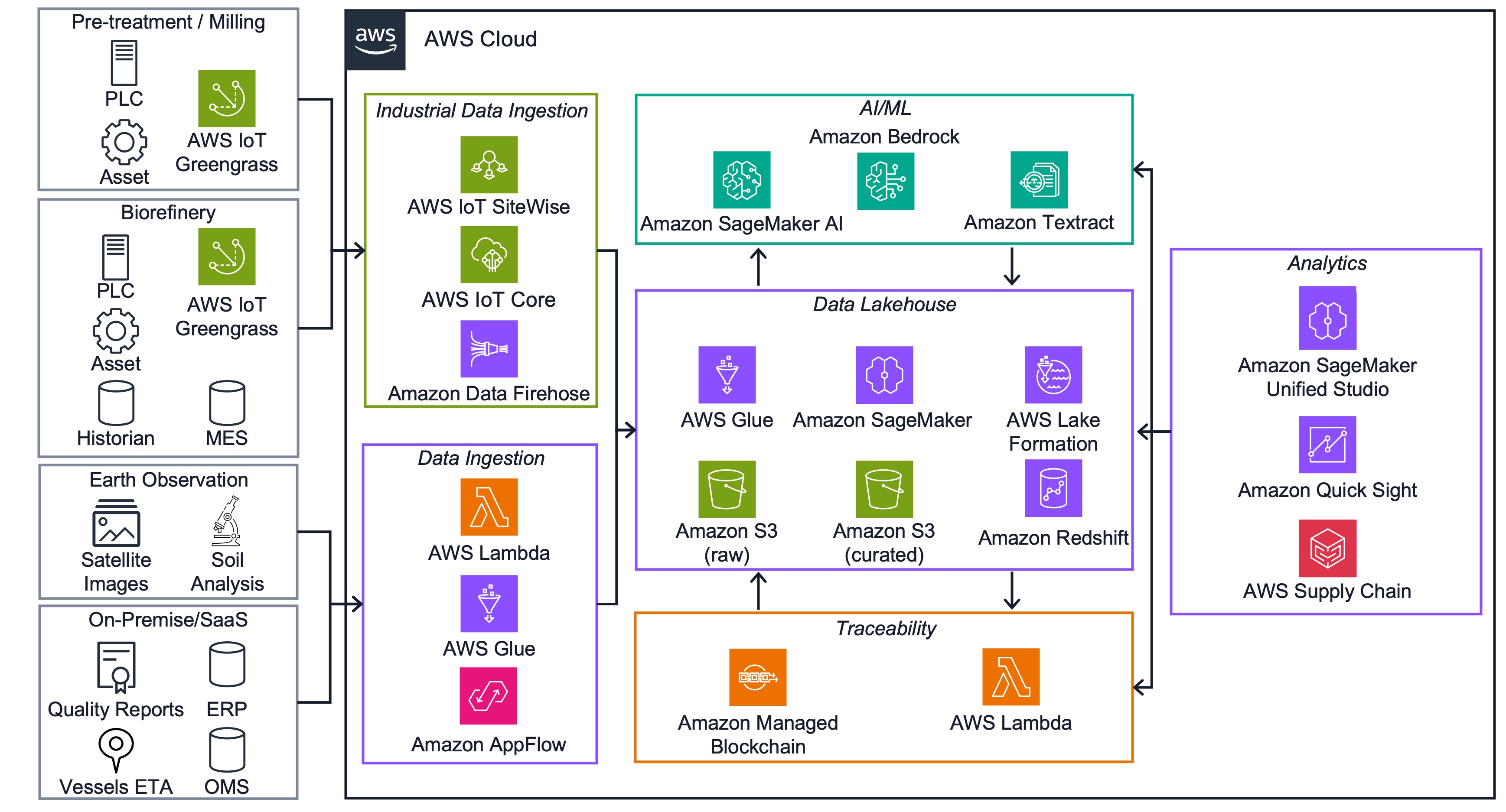 In addition to that, Amazon Textract can be used to extract information from reports (feedstock quality and soil analysis), Amazon Bedrock provides large language model (LLM) access and agentic workflows to assist knowledge workers.