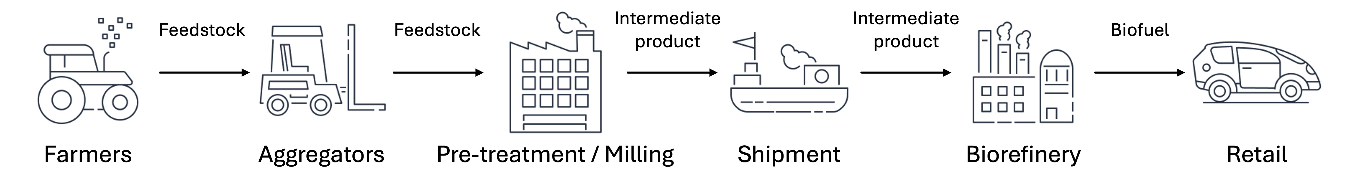 It is possible to simplify the biofuel supply chain in few key stages. Farmers grow crops and ship them to aggregators. Aggregators in turn supply pre-treatment facilities with feedstock. Intermediate product from pre-treatment plants, such as vegetable oil in the case of HVO, is stocked and shipped to biofuel refineries. Biorefineries produce biofuel, ready to be distributed to fueling stations.