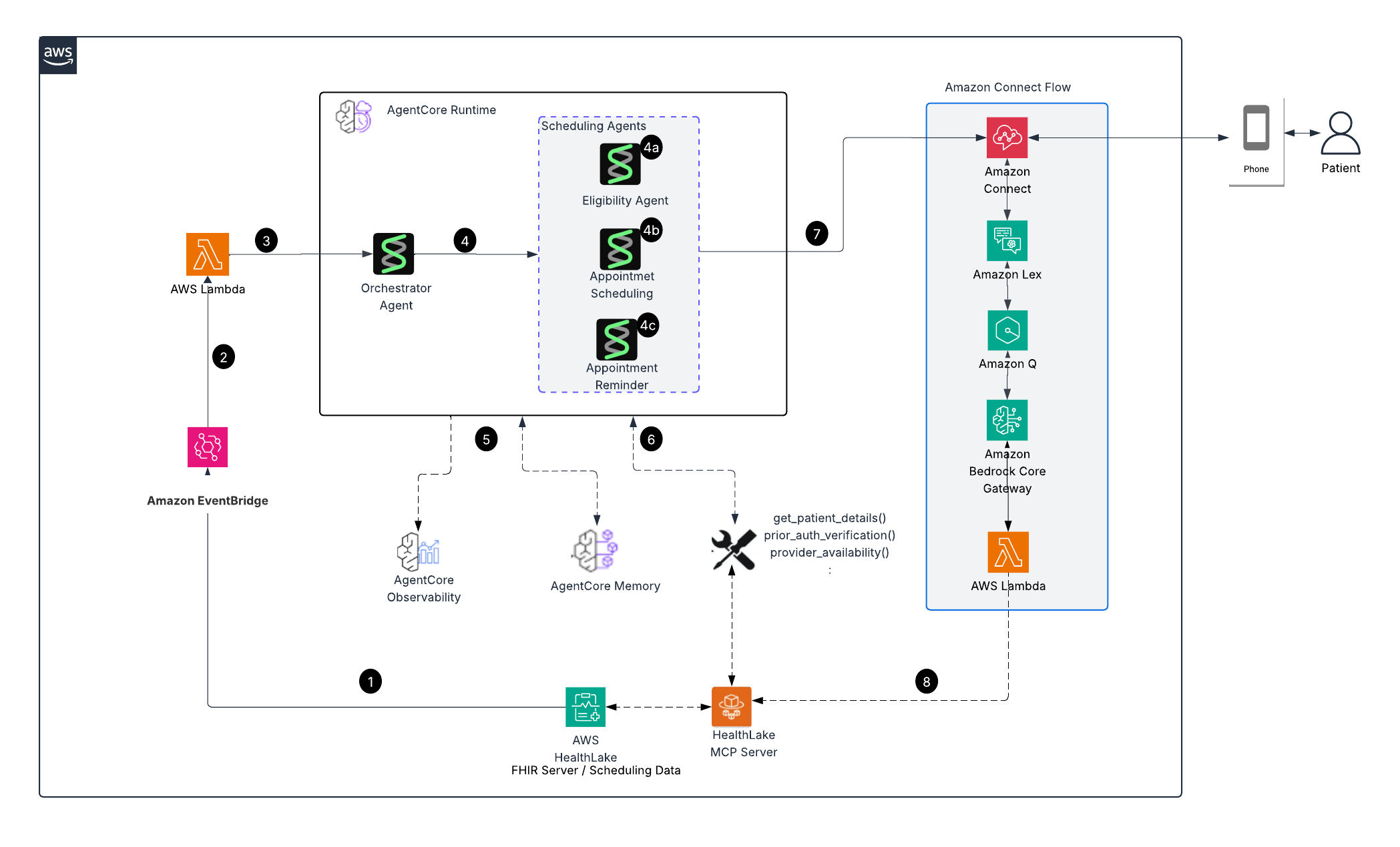 The patient experience when leveraging an automated workflow is different: when a patient’s prior authorization is approved, Amazon Connect automatically initiates the scheduling workflow. Strands Agents, an open-source, autonomous AI agent framework running on Amazon Bedrock AgentCore, coordinate behind the scenes. They check available appointment slots, confirm procedure requirements, and prepare outreach—all while maintaining HIPAA compliance and patient privacy controls.