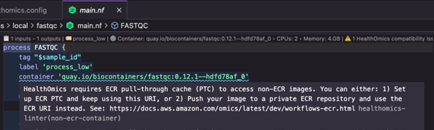 A built-in compatibility checker validates your workflows against HealthOmics requirements in real time, catching issues like unsupported directives or incorrect container formats before you ever attempt a deployment (Figure 3).