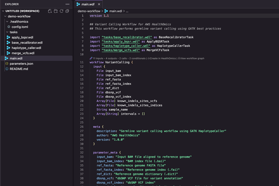 Figure 6: A WDL variant calling workflow generated by Kiro following HealthOmics best practices.