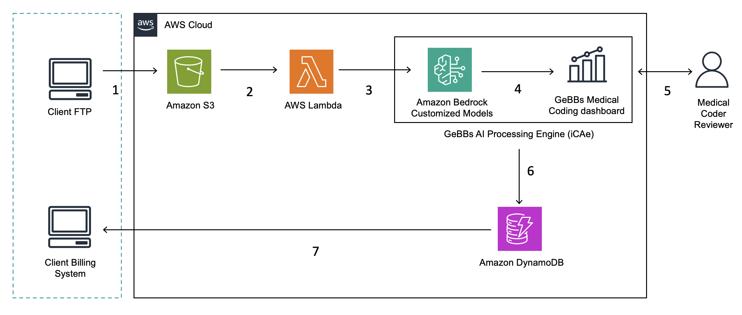 The GeBBs solution is entirely AWS-native, utilizing a comprehensive suite of services to deliver high-performance medical coding while maintaining strict healthcare compliance standards.