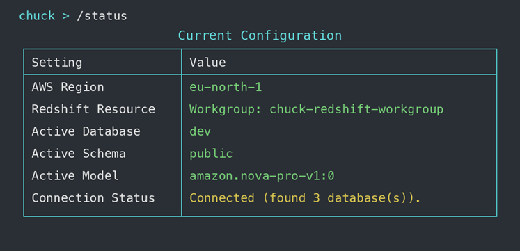 Figure 1 shows the Chuck Data CLI `/status` output displaying the current configuration — connected to an Amazon Redshift workgroup in `eu-north-1`, using Amazon Nova Pro (`amazon.nova-pro-v1:0`) as the foundation model, with a confirmed connection to 3 databases.