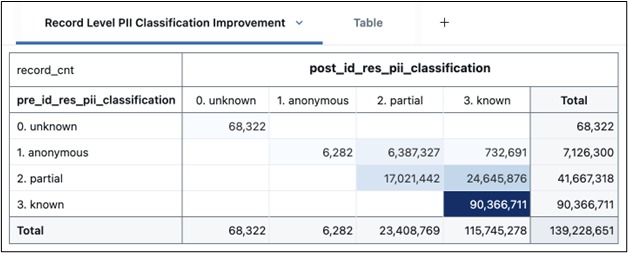 Figure 3 shows the Record Level PII Classification Improvement matrix, which displays how customer profiles were reclassified. Rows represent pre-resolution PII classifications (unknown, anonymous, partial, known) and columns represent post-resolution classifications. The darkest cells along and above the diagonal show upward mobility — notably, 24,645,876 partial records were upgraded to known, and 90,366,711 records retained their known status. Post-resolution, 115,745,278 of 139,228,651 total records (83%) achieved “known” classification, demonstrating improvement in customer profile completeness.