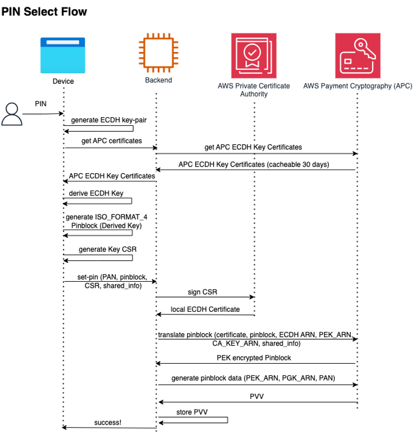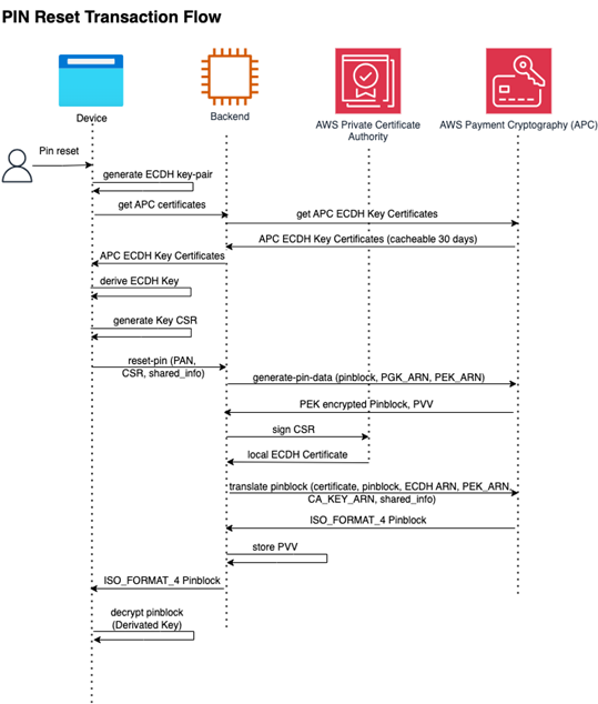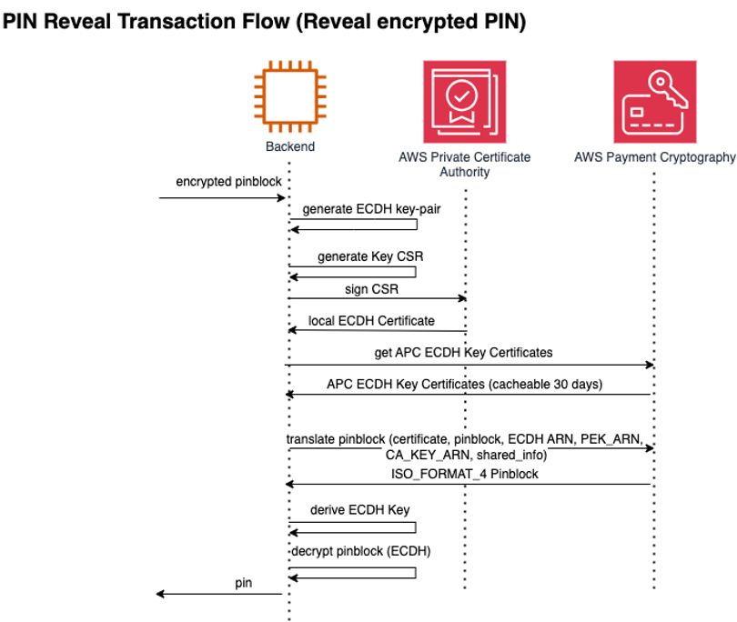 In this example we have an implementation between a mobile application and a backend application that interacts with AWS Payment Cryptography using Elliptic Curve Diffi Hellman (ECDH) algorithm to protect the PIN in transit.