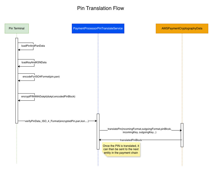 2. PIN Translation. PIN translation functions are used to translate encrypted PIN data from one set of keys to another without the encrypted data ever leaving the HSM. In a typical scenario, a user enters a PIN on a payment terminal. The PIN gets encrypted with the payment processor’s key within the terminal and is sent to the processor. The payment processor then translates the PIN from its key to the acquirer’s working key (AWK) before passing it to the acquirer. This translation flow then continues through other entities, payment networks, and finally the issuer of the card which validates the PIN. The PIN translation across the entities can be between different ISO formats. For example, the payment terminal can encrypt the PIN in ISO4 format, and the processor can translate it from ISO4 to ISO0 format. AWS Payment Cryptography supports PIN translation functions for ISO0, ISO1 and ISO4 PINblock formats. The diagram below illustrates this flow in the sample application.