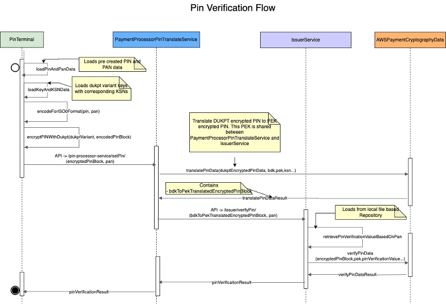 Once the user sets the PIN, you can run the following set of commands which trigger the flow to verify the PIN. In this flow, the PIN in the PINTerminal (typically payment terminal in merchant store) is encrypted in ISO0 standard.