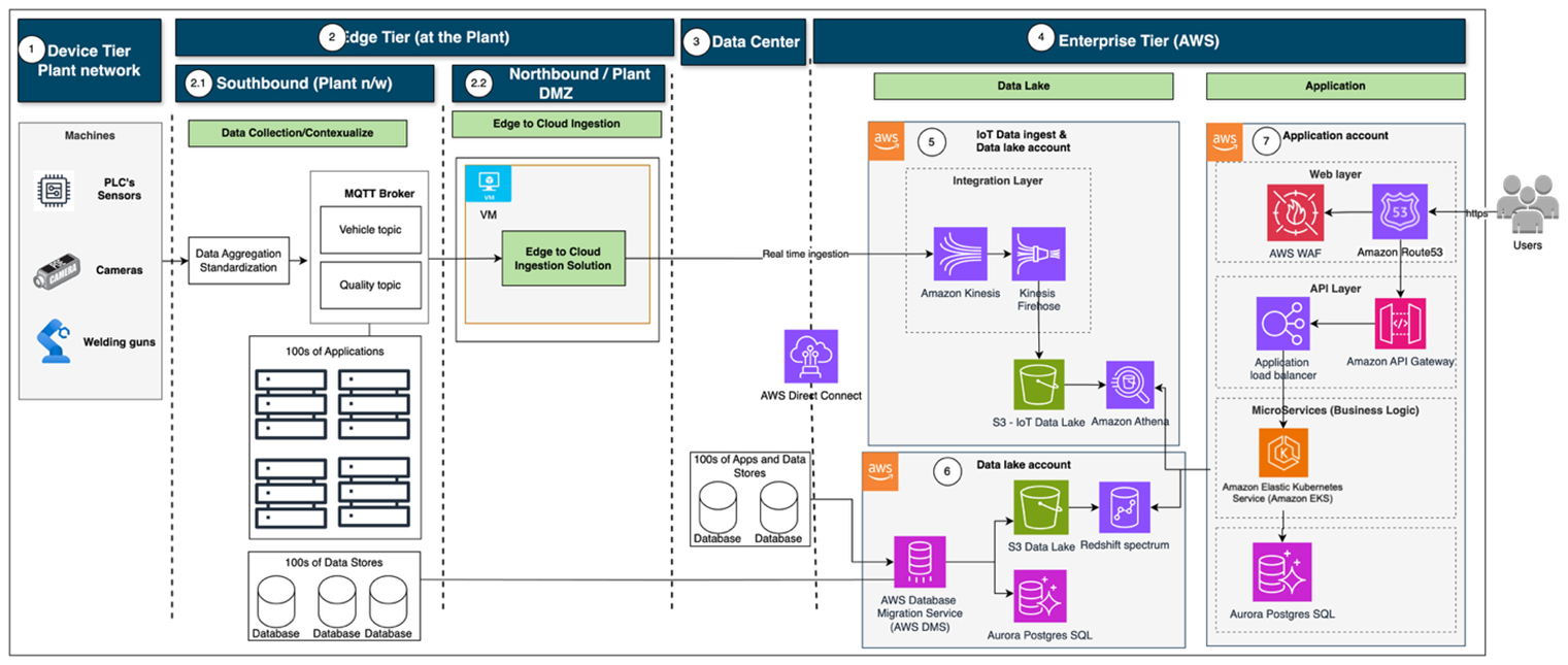 1. Device Tier – Located on the shop floor area within the plants, this tier includes sensors, PLCs, cameras, robots, mills, presses, and welding guns that generate real-time operational data.
