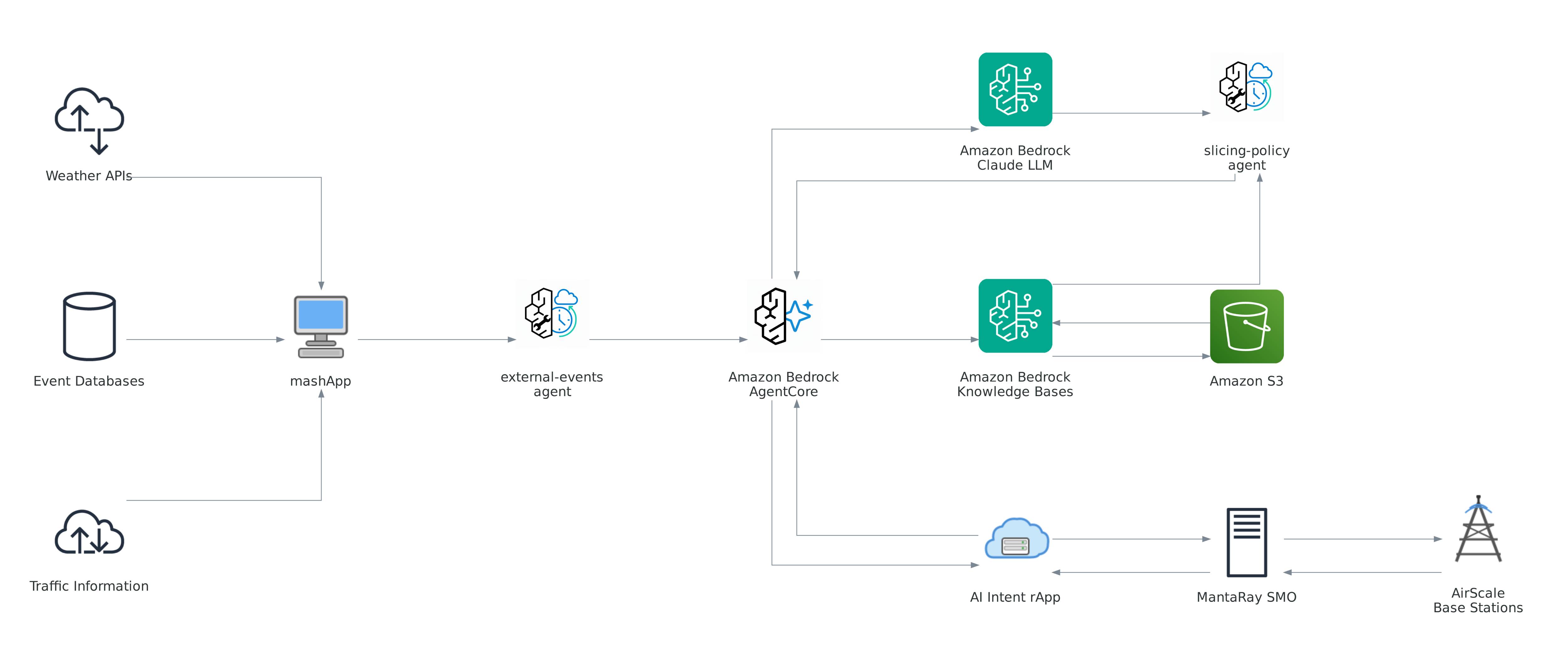 AgentCore supports multi-agent collaboration through Agent-to-Agent (A2A) protocol support and parallel orchestration, demonstrating how specialized agents, one for parameter estimation and one for external context, can collaborate to achieve complex network optimization that neither could accomplish alone. Within Nokia’s intent-based network slicing architecture, these AgentCore services work together to power the two specialized Nokia AI agents. The slicing-policy-agent leverages AgentCore Runtime for secure, scalable execution of long-running optimization workflows, uses AgentCore Memory to maintain context about historical network performance patterns and previous RAN configurations across sessions, accesses Amazon Bedrock Knowledge Bases through AgentCore Gateway to retrieve relevant historical parameters from S3, and relies on AgentCore Observability for complete traceability of parameter estimation decisions. Similarly, the external-events-agent utilizes AgentCore Runtime for continuous monitoring of external data sources, employs AgentCore Memory to track evolving contextual patterns (weather trends, recurring events, traffic patterns), connects to third-party APIs through AgentCore Gateway using Model Context Protocol (MCP), and provides full visibility into its reasoning through AgentCore Observability. Both agents communicate via the standardized Agent-to-Agent (A2A) protocol supported by AgentCore, enabling them to collaborate seamlessly. The external-events-agent shares contextual intelligence with the slicing-policy-agent, which combines this with intent parameters and historical data to generate optimized RAN configurations that are then deployed autonomously through MantaRay SMO APIs, all while maintaining complete audit trails for telecommunications compliance requirements.