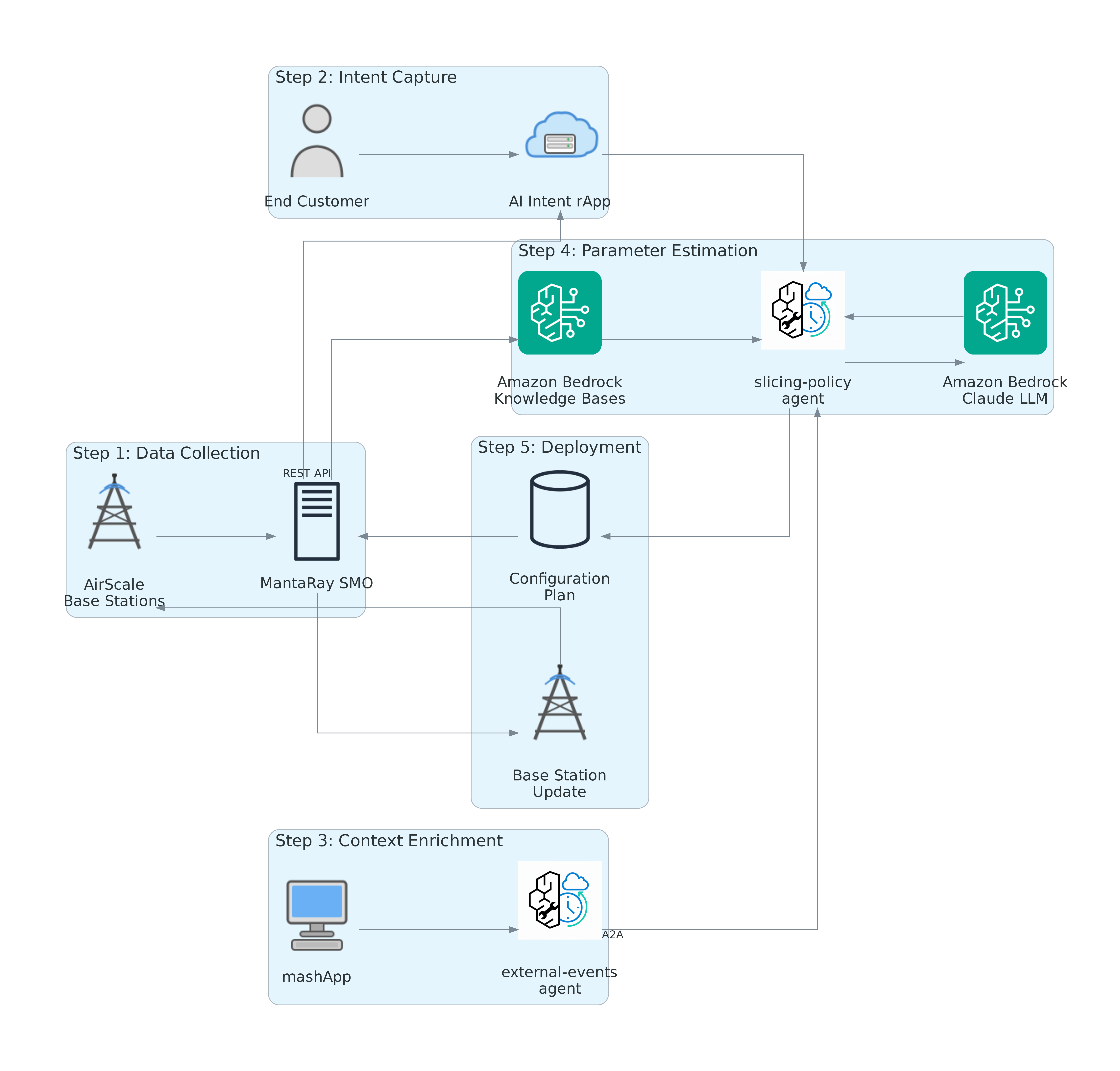 At the foundation, Nokia’s infrastructure layer consists of AirScale Base Stations that generate real-time performance counters including throughput, latency, and resource utilization metrics as well as enforce network slicing policies. Nokia’s MantaRay Service Management and Orchestration (SMO) aggregates real-time performance data from base stations and executes configuration changes recommended by the AI intent RAN application (rApp). This rApp leverages specialized Nokia AI agents running on Amazon Bedrock AgentCore to analyze network data, apply reasoning, and generate optimized slicing configurations that will be executed by MantaRay SMO.