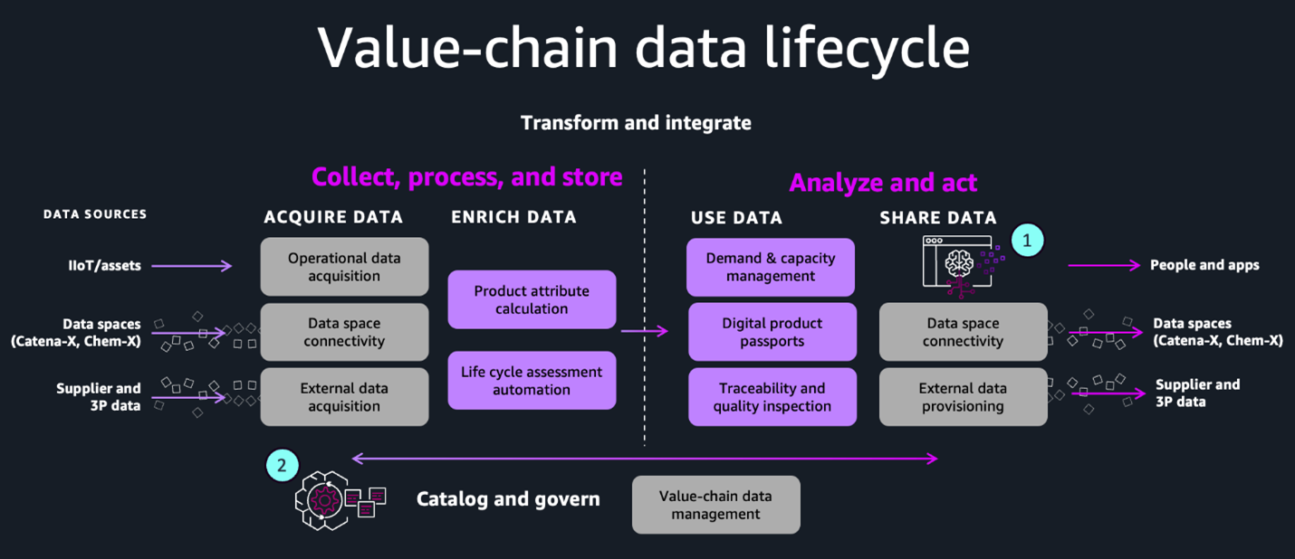 Using SDF as the foundation for DPP solutions enables AI agents to operate on trusted, verifiable data, resulting in compliant sustainability reporting and strategic decision-making—fueling circular economy business models. Figure 2 provides an overview of the value-chain data lifecycle for industrial customers, from collecting data from operational systems and third parties to data enrichment and preparation, consumption in data products, and concluding downstream sharing. SDF provides data governance, auditability, and lineage of data sets as they pass through.