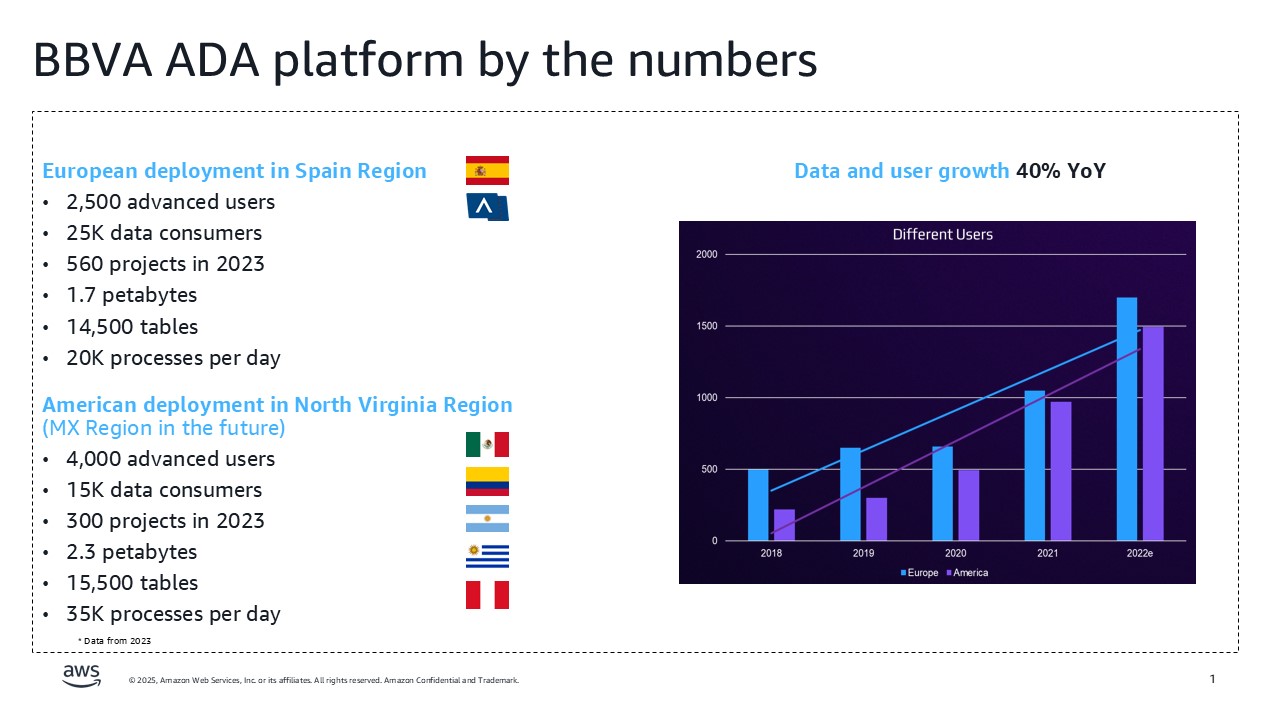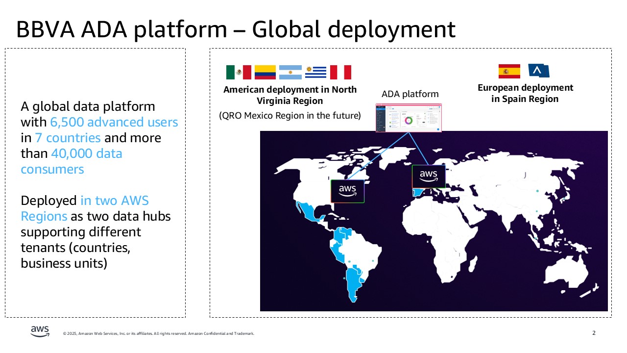 In an era where data drives financial innovation, BBVA, a global financial institution serving over 76 million customers across 25+ countries, partnered with AWS to revolutionize its data analytics capabilities. BBVA embarked on an ambitious three-year journey to transform its entire data analytics infrastructure. The Analytics, Data, AI (ADA) Global Data platform represents one of the largest and most complex cloud migrations in the banking sector, which marks a significant milestone in BBVA’s digital transformation strategy.