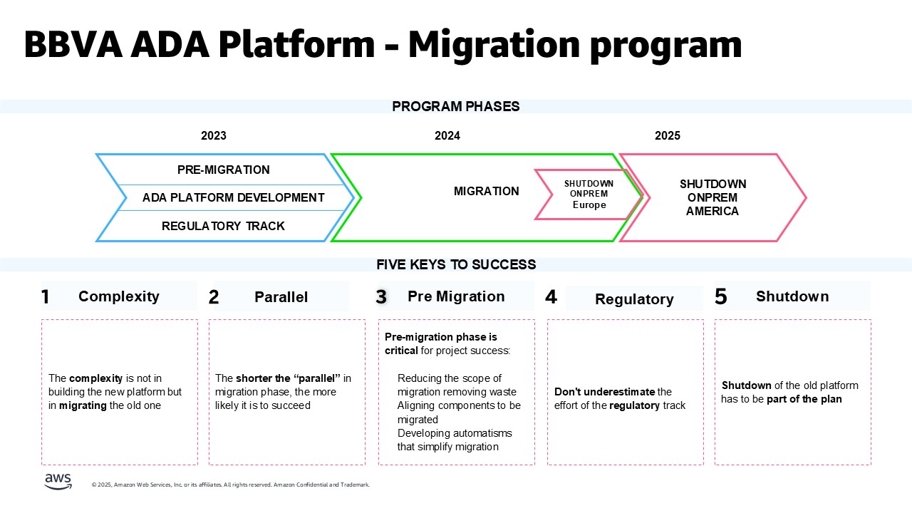 - Parallel Operations are Tough: The team learned that shorter parallel phases are better as BBVA faced challenges with end users that had to work managing two platforms simultaneously, when running over 50,000 daily jobs to effectively reach a success rate to give the “green” light for the “go-live” on AWS ADA platform.