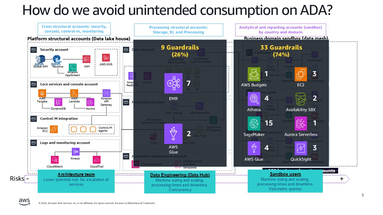 BBVA has deployed structural guardrails, which apply to the data processing accounts as depicted in the ADA Global architecture. BBVA was aware based on experience that where “humans” operate is where there is greater risk of unintended consumption. Therefore, by default within the sandbox accounts is where BBVA deployed the majority of guardrails and controls.