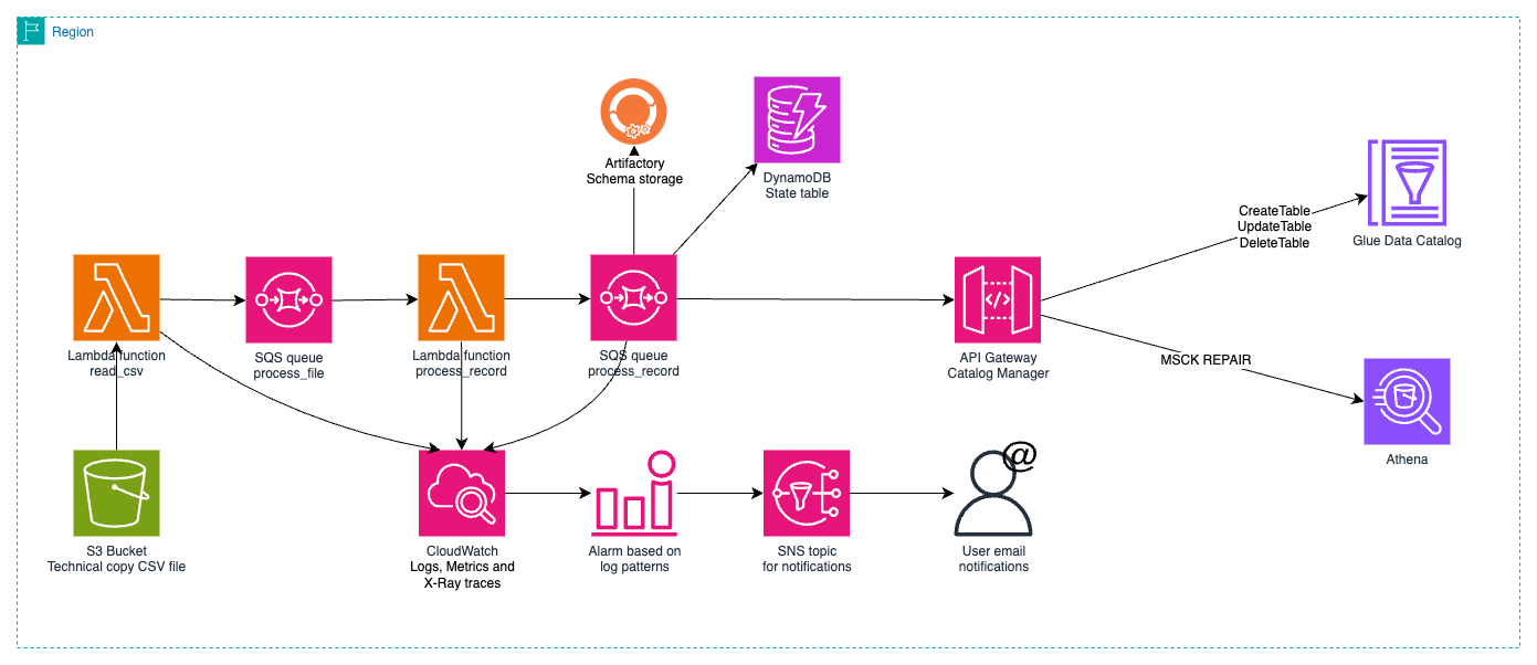 To ensure a successful platform migration, BBVA needed to create a centralized catalog in AWS. Although they didn’t have an on-premises catalog, they maintained a centralized registry where each project stored metadata and version history of their file formats. BBVA, in collaboration with AWS and other partners, developed a process to migrate this inventory data, including both initial synchronizations and incremental updates.