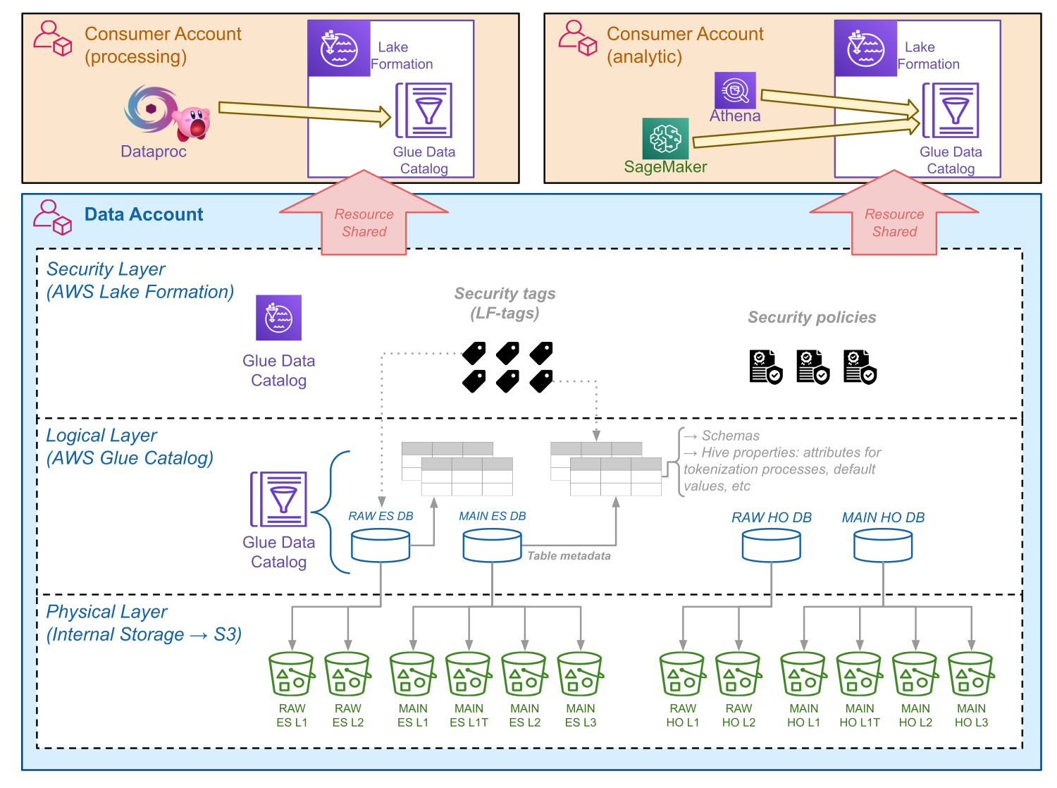 One of the key requirements during BBVA’s migration was the proper cataloging of data to enhance control, management, and permission handling. To achieve this, BBVA opted for a combination of AWS Glue Data Catalog and AWS Lake Formation. The AWS Glue Data Catalog serves as a managed persistent technical metadata store, allowing BBVA to store, annotate, and share metadata in the AWS Cloud. AWS Lake Formation complements this by providing centralized governance, security, and global sharing capabilities for analytics and machine learning data.